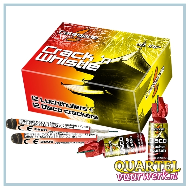 The factory description is as follows: Crack n Whistle, 24-piece combination box. This set contains the extremely popular Disco Crackers, small but robust crackling fountains and the new hype Luchthuilers with their extremely shrill whistle. This set contains 12 pieces of both items.