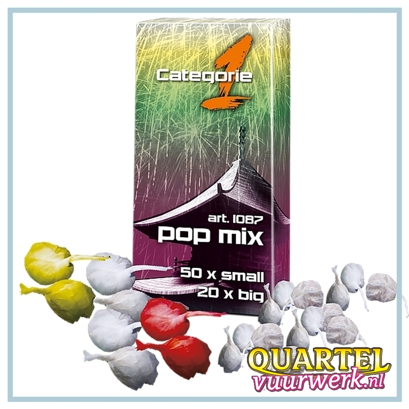De fabrieksomschrijving luidt als volgt.: Pop Mix, een doosje met 70 stuks knalerwten. Deze knalerwten zijn onderverdeeld in twee types. 50 stuks van de originele maat knalerwten, en 20 stuks van de grote gekleurde maat knalerwten.