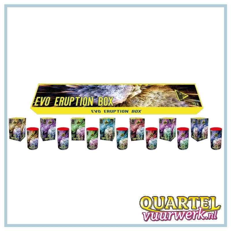 De fabrieksomschrijving luidt als volgt.: EVO Eruption Box. Assortimentsdoos met 14 verschillende categorie 1 sierfonteinen. Prachtig siervuurwerk, wat ook al voor 18.00 uur mag worden afgestoken!