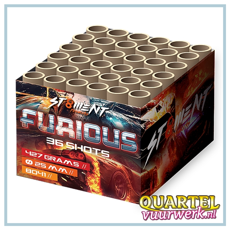 Furious is een siercake met 36 woest mooie schoten in 25mm kaliber. Perfect voor iedere collectie.