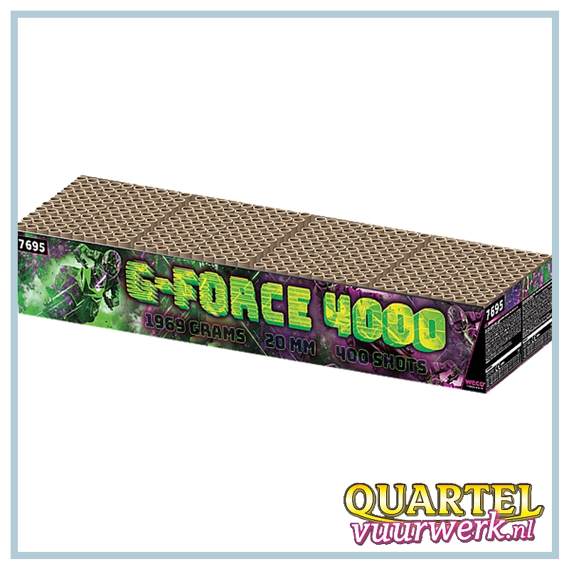 Terug van weggeweest bij WECO Feuerwerk, de G-Force serie. Grote bakken ramvol met siervuurwerk om een complete vuurwerkshow neer te zetten. Deze G-Force 4000 is een compound met maar liefst 400 schoten! De tubes zijn uitgewerkt in 20mm tubesize, met een heerlijk snelle verbinding, want gang is alles. In hoog tempo schiet deze 400 shots compound zijn effecten per salvo de lucht in. Diverse kleuren en variaties bouwen op, waarna de finale een overtreffende show neerzet. Het product om je eigen vuurwerkshow neer te zetten!