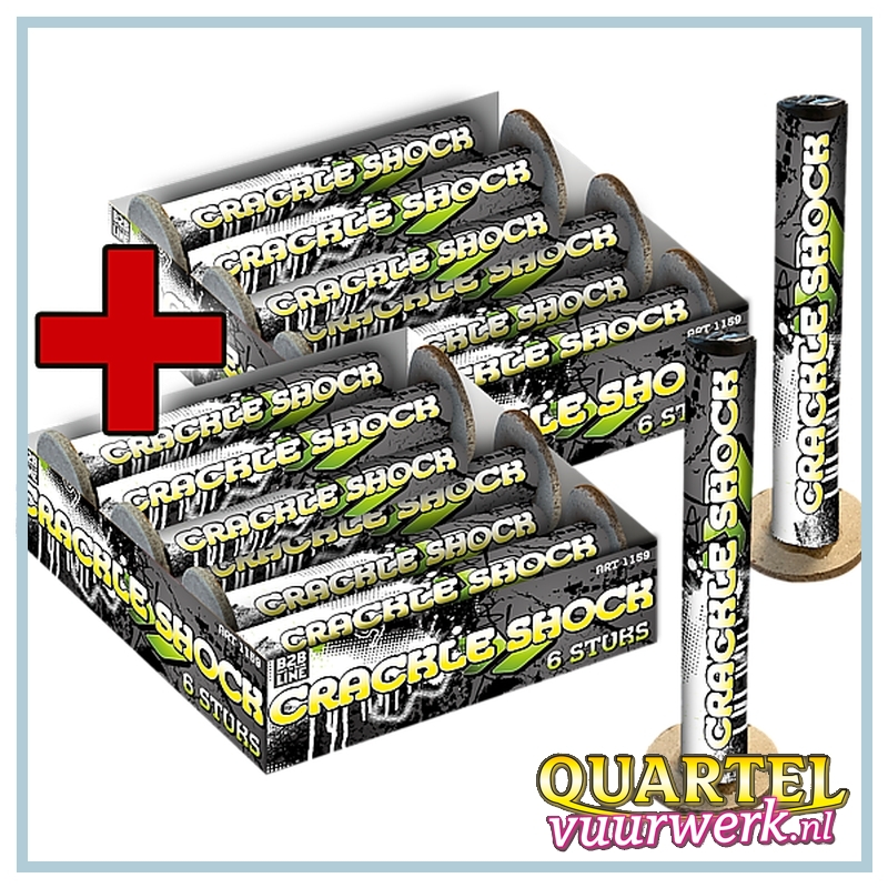 De fabrieksomschrijving luidt als volgt.: Set van zes stuks Crackle Shock fonteinen. Zeer heftige fluit, gevolgd door een heftige knetterwolk. Geclassificeerd als categorie 1, dus 365 dagen per jaar legaal af te steken.