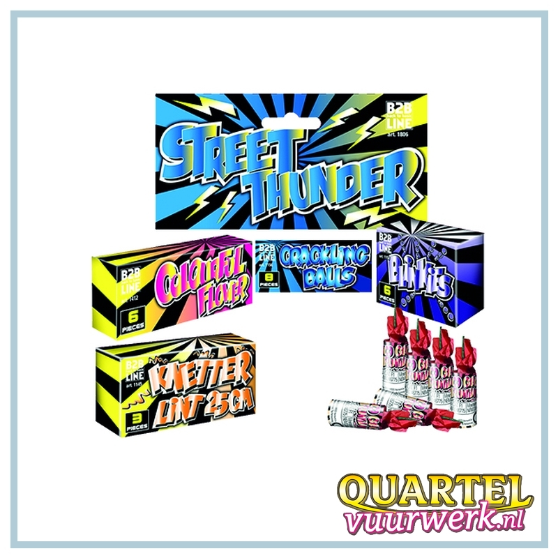 De fabrieksomschrijving luidt als volgt.: B2B Street Thunder Kindervuurwerkpakket. Dit product is CAT1 en mag het hele jaar.