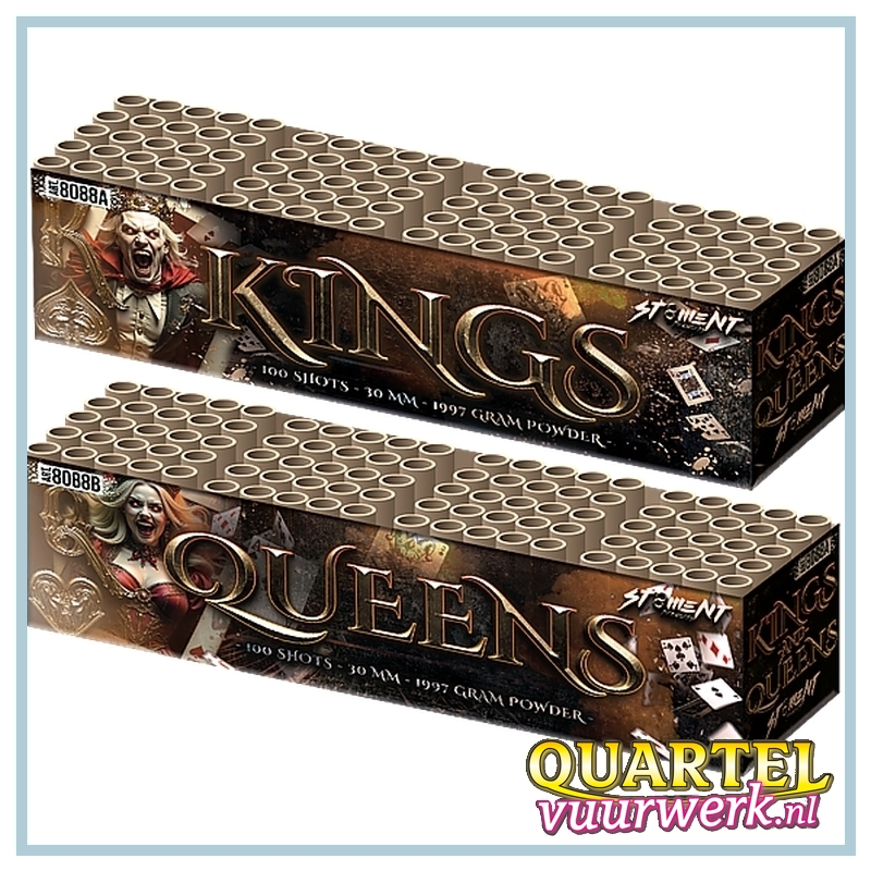 Kings and Queens is een set van twee dikke 100 shots 30mm compounds. Gezamenlijk geniet u met deze set van een vuurwerkshow van maar liefst 200 schoten van het sierlijkste vuurwerk in de maximale uitvoering!
