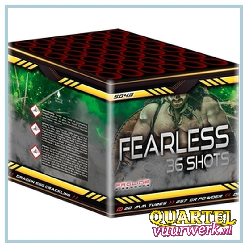 Fearless, 36 shots, 20mm cake. Prachtige blauw/groen gekleurde peony, palmen met groene parels, palmen met blauwe parels, palmen met dragon eggs, en een knetterende finale.