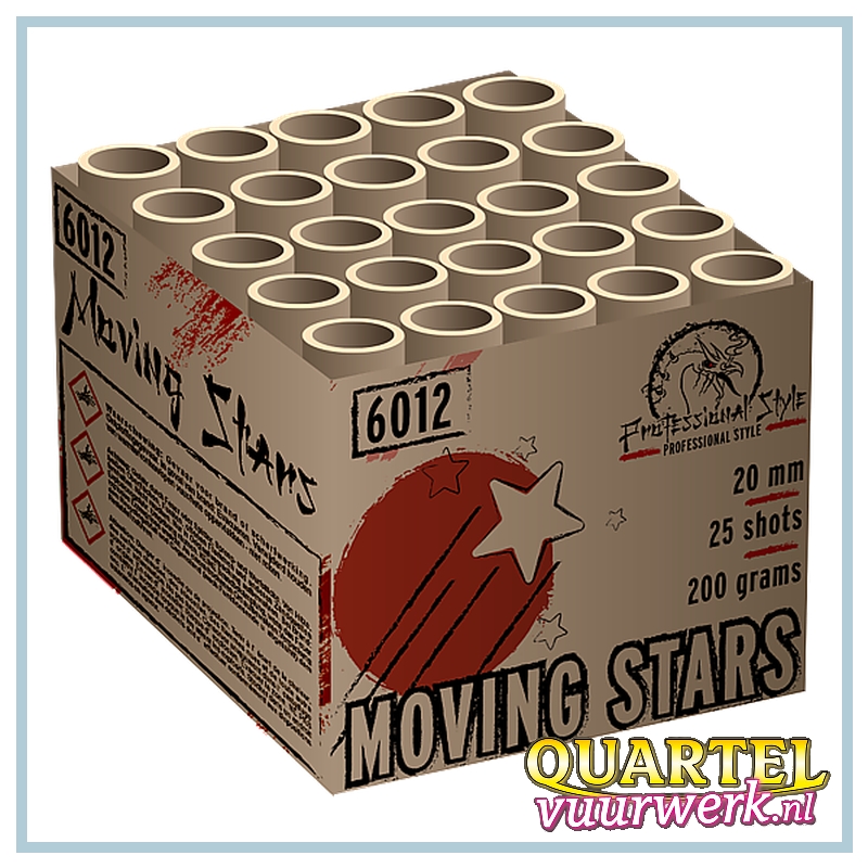 De Moving Stars is een 25 shots siercake met 20mm tubeszie. Als effect heeft deze cake bewegende sterren, moving stars, welke verrassende richtingen op krullen. Mooi staaltje vuurwerk.
