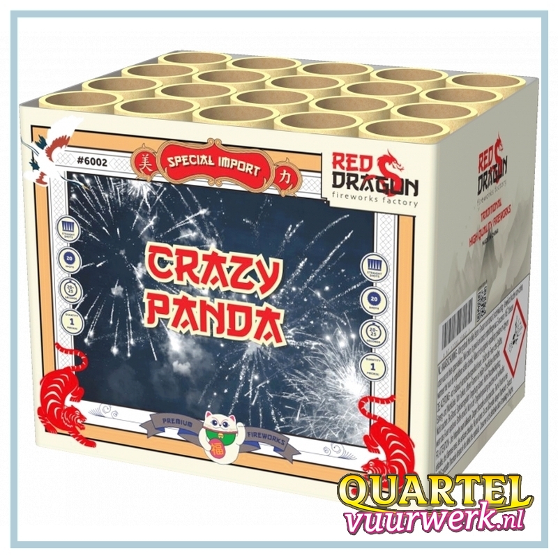 De fabrieksomschrijving luidt als volgt.: Klein maar fijn, dat is de Crazy Panda. 20 schoten met rode, groene, paarse en gele sterren gecombineerd met heftige crackling.