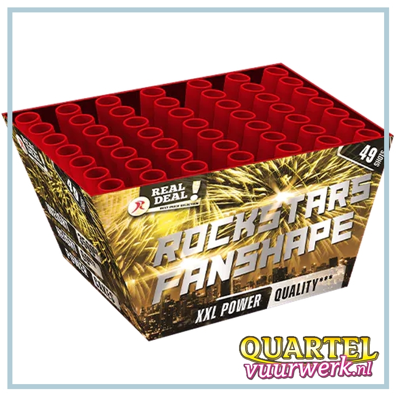 De fabrieksomschrijving luidt als volgt.: ROCKSTARS FANSHAPE 49 SHOTS is een compacte maar krachtige cake met 49 schoten. Klein van formaat maar groot in uitstraling, dit product zorgt voor effecten die indruk maken en perfect passen in elke vuurwerkshow.