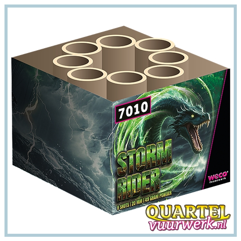 Storm Rider van WECO Feuerwerk is een kleine maar fijne siercake met 8 schoten in 20mm tubesize. Deze kleine cake is ontwikkeld volgens de laatste veiligheidsnormen zodat het grondvlak groter is, wat de cake stabieler maakt dan een originele 8 schots cake.
