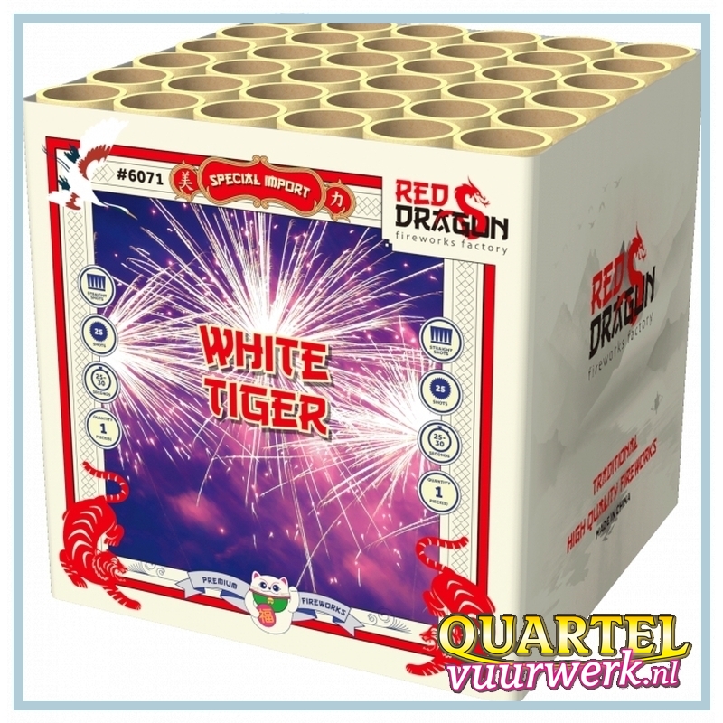 Deze White Tiger bevat als hoofdkleur natuurlijk de kleur wit! Een prachtig 25 schots schouwspel aan kleuren van onder andere rood, wit en blauw!