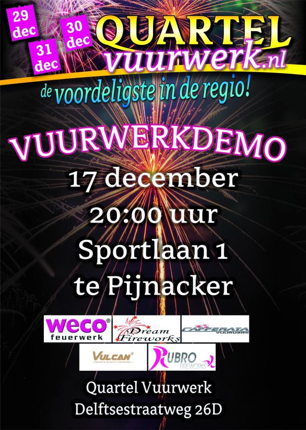 Dagen Uren Minuten Seconden Vuurwerkdemo 2024 Vuurwerkdemo 2023 Vuurwerkdemo 2022 Vuurwerkdemo 2020 (Afgelast ivm Covid-19) Vuurwerkdemo 2019 (Afgelast ivm Covid-19) Vuurwerkdemo 2018 Vuurwerkdemo 2017 Vuurwerkdemo 2016 Vuurwerkdemo 2015 Vuurwerkdemo 2014 Vuurwerkdemo 2012 (eerste jaar)